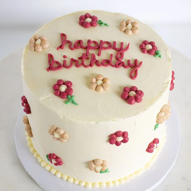 Classic vanilla bean cake is layered with vanilla pastry cream and frosted with vanilla Swiss meringue buttercream.